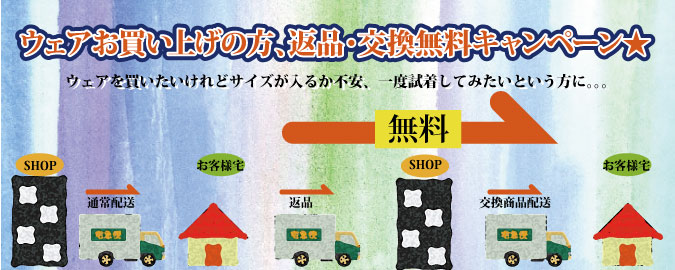 オンラインショップでウェアをお買い上げの方で、返品・交換をご希望の方は、電話またはSHOPmailまでご連絡いただければ、返品・交換分の配送料を無料に致します!!